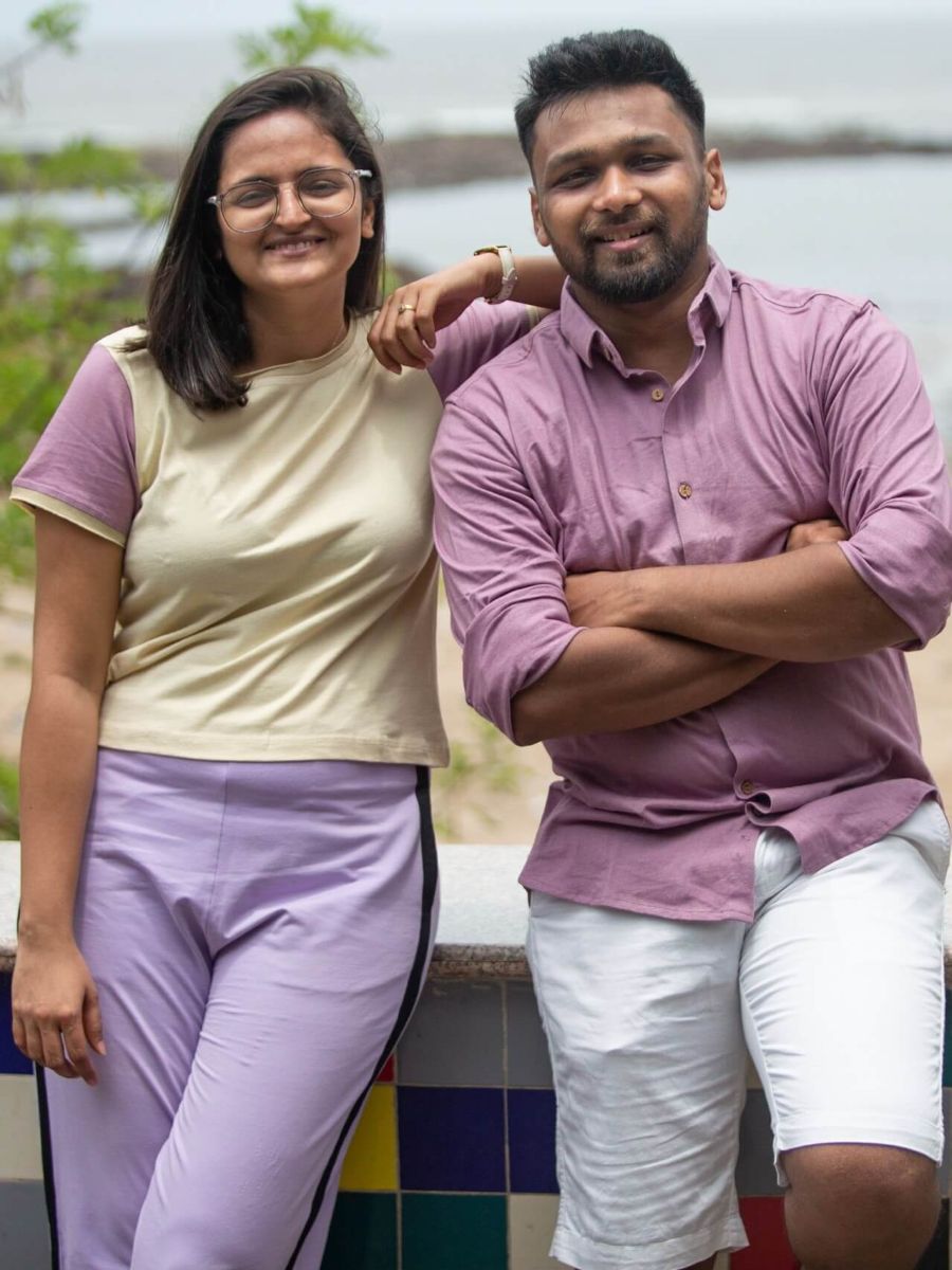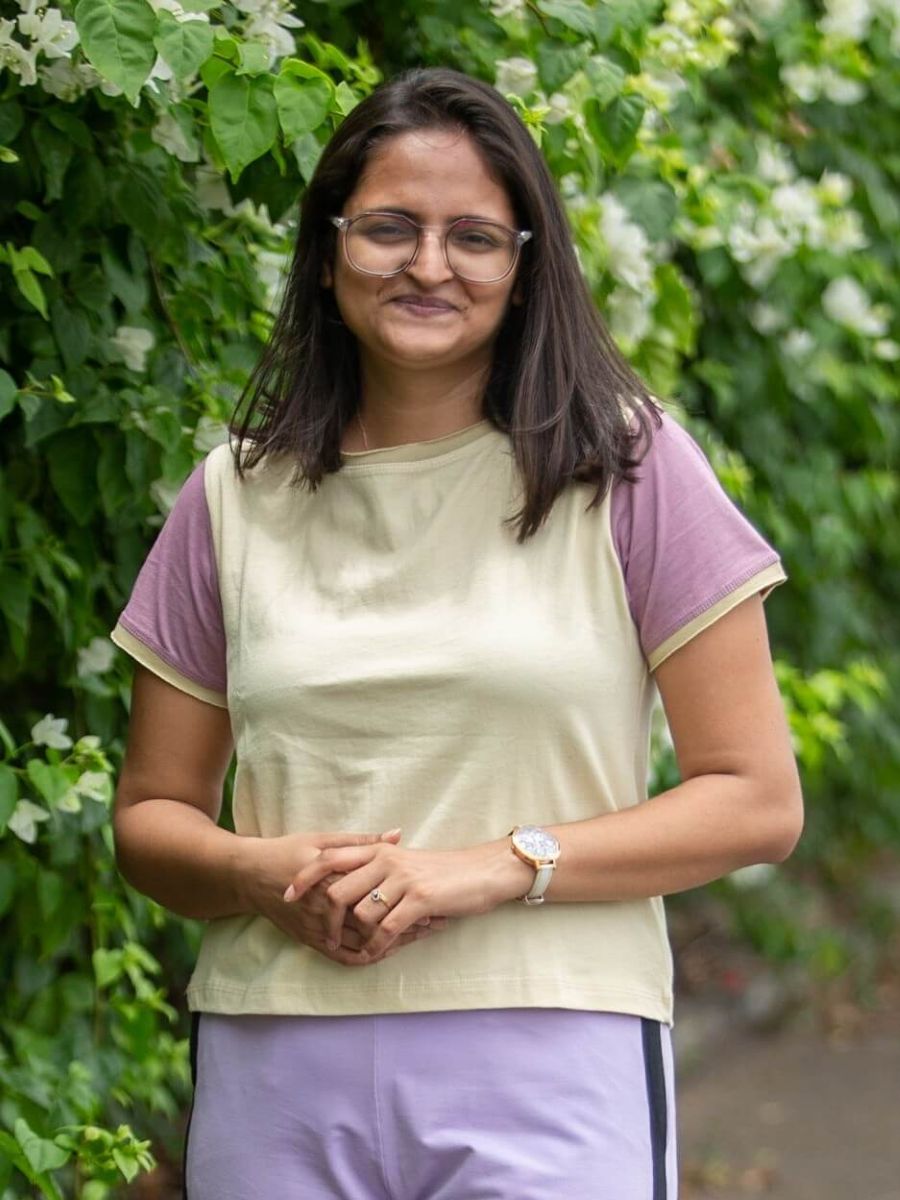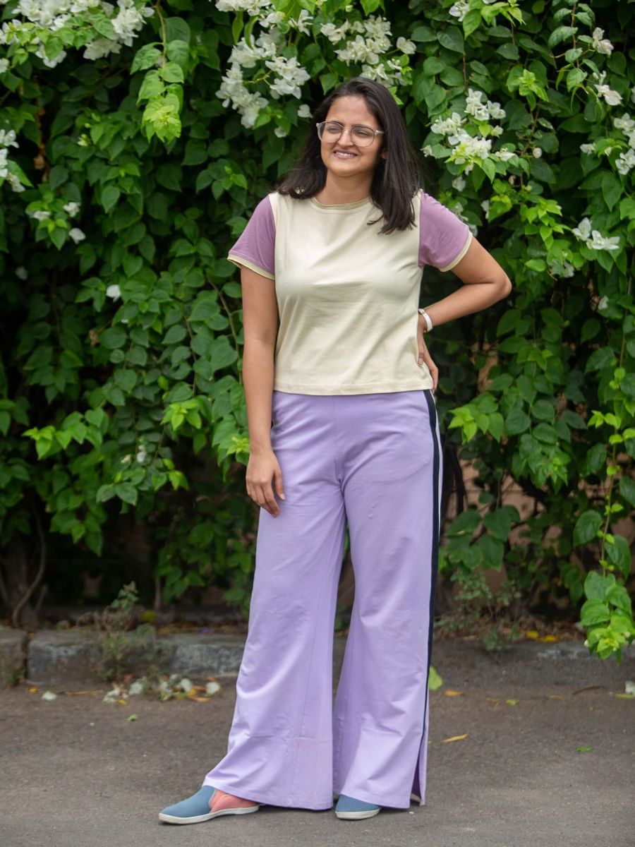 Naturally dyed and crafted from organic cotton, this cream and lilac crop top blends soft tones with a bold color block twist. Its modest crop length ensures comfort and free movement, making it ideal for casual wear or layering during workouts.